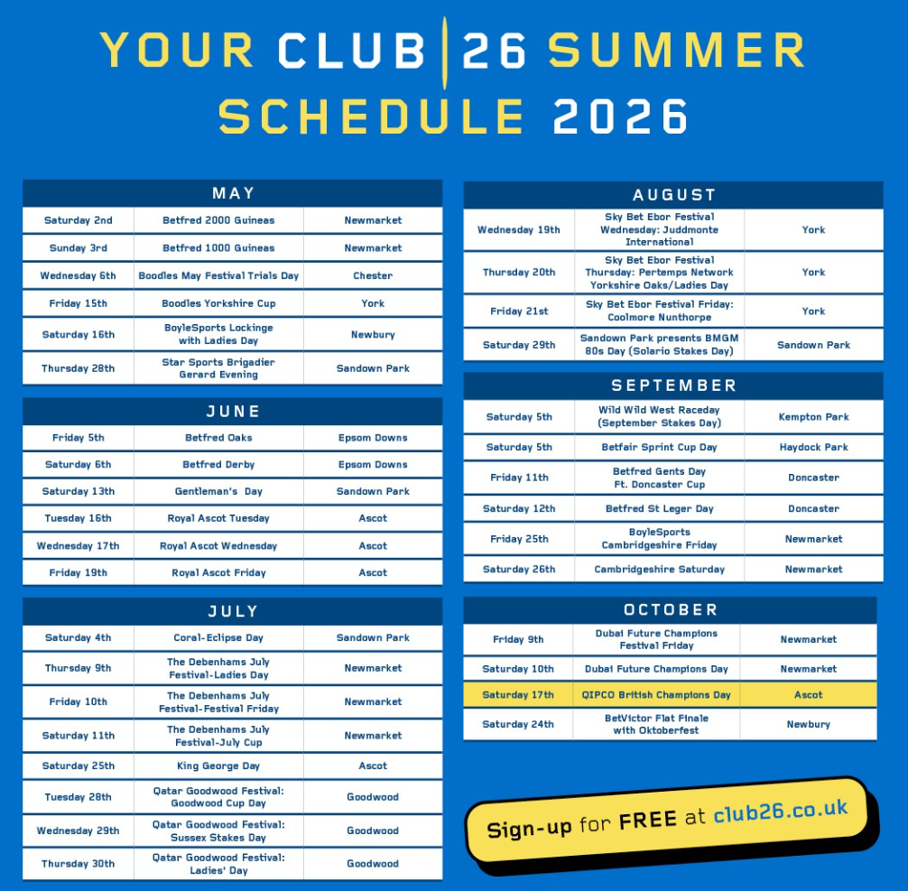 Join Club26 for FREE and gain access to discounted tickets to all Group 1 Flat fixtures throughout the summer and many more race meetings not to be missed!